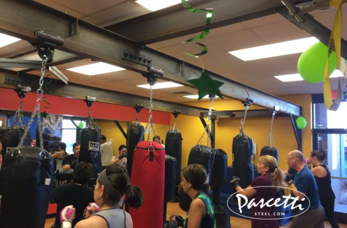 Pascetti Steel has recently designed, fabricated and installed custom commercial gym equipment for two local gyms in Albuquerque. Pascetti Steel fabricated a new engineered system for multiple heavy bags at the Open Gym. This rack holds up to thirty heavy bags on a rolling track system to easily move the bags for other activities.