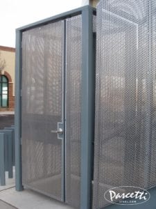 A branch of Sandia Area Federal Credit Union in Albuquerque, NM recently received a facelift on one of their outdoor stairwells courtesy of Pascetti Steel Design. This custom perforated metal enclosure features anti-graffiti natural aluminum finish, trimmed edges, and of course, complete installation. Pascetti Steel Design offers custom perforation on all types of metal, including stainless steel, aluminum and Corten, so that each individual project can meet the specific needs of the architect and owner.