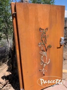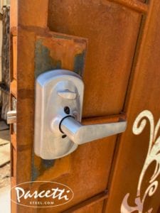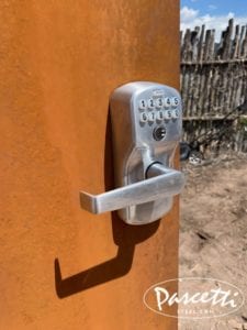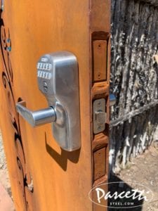 Custom plasma cut gate with floral design and a combination lock box. Gates do much more than provide security and privacy; they also add beauty to homes and landscapes. Whether it’s a simple steel picket gate for a patio, or one of our custom forged ornamental steel gates, we’ll help you select the right gate and latch combination for your setting. Our plasma cut driveway gates are fabricated entirely by hand from raw material to finished product. Every individual gate is unique in its own way.