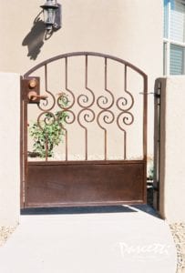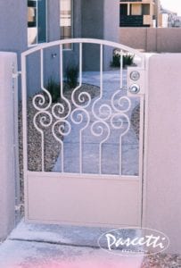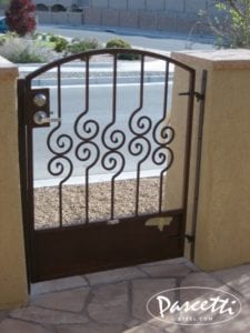 Our custom gates are designed for courtyards, patios, entries, pools and more with a wide range of styles from picket gates, security gates, custom designed gates and gates for ornamental garden fencing. Choose from several latch styles to suit your needs. Any style can be converted to a pool gate with self- closing hinges and locks to meet code and safety requirements. Top corners of all gates are mitered, welded, and sanded smooth: plastic caps are never used at Pascetti Steel.