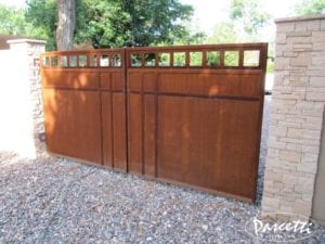 Custom steel residential privacy gates and steel panel system with locking cane bolt and slide latch locks complete with a natural rusty finish.