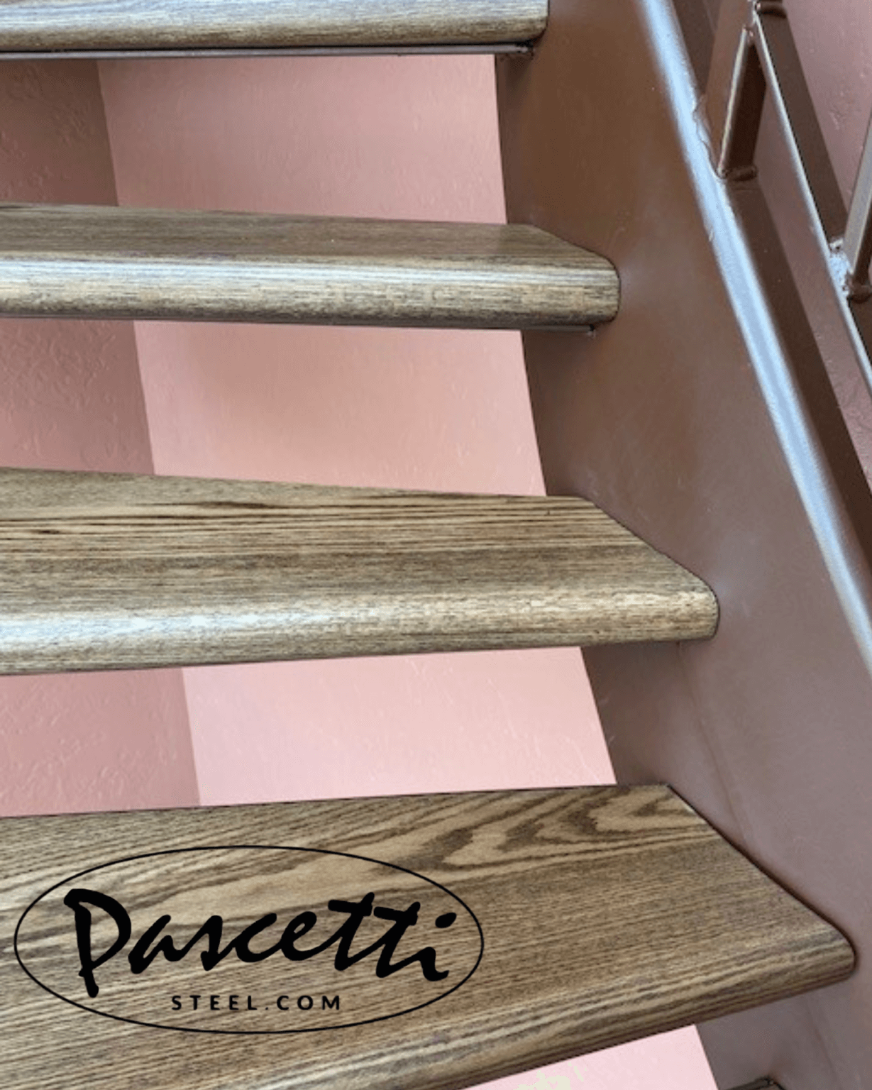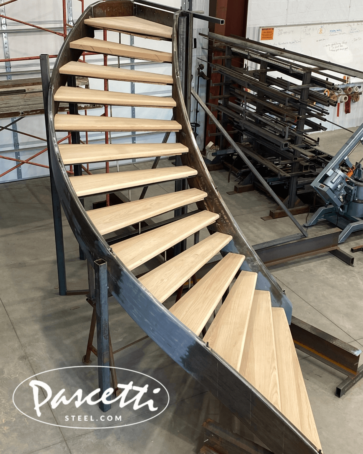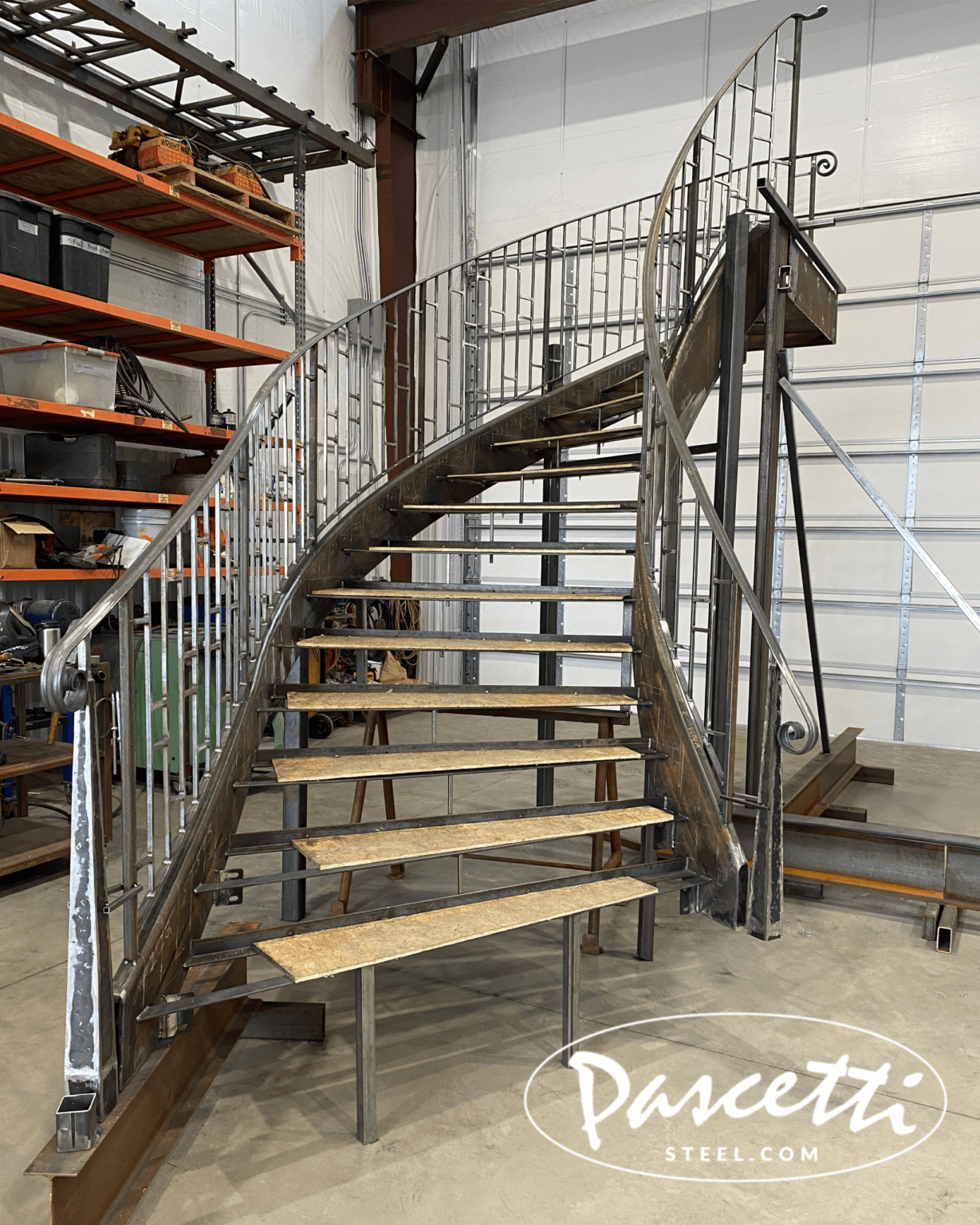 This project was shipped in a single-piece curved stair, railings were pre-painted and welded to stringers in the field. Complete custom paint was applied then custom-formed treads were installed. Both the customer and the fabrication team at Pascetti Steel were thrilled with the finished product.