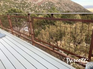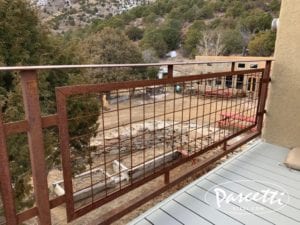 Custom maintenance-free balcony rails with mesh infill and natural / rust finish.