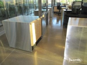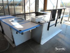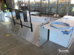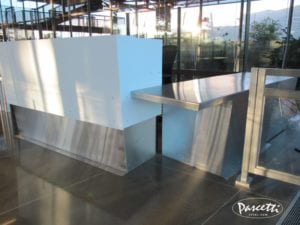 Pascetti Steel designed, fabricated, and installed the stainless-steel pedestrian inspection kiosks at the new Mariposa Land Port of Entry in Nogales, AZ. These stations served as the initial public questioning areas for the many pedestrians entering the US. These very specialized stations are made from 100% stainless plates formed from large single sheets and then mechanically fastened with other powder-coated frames in the field. Each of the desks has a swinging desk section to help keep the officers safe and the public moving freely through the area. Each of the complex kiosks contains data, phone, security, and video controls.