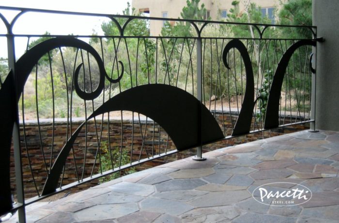 Custom residential plasma cut steel railings with accent panels located in Albuquerque, New Mexico.
