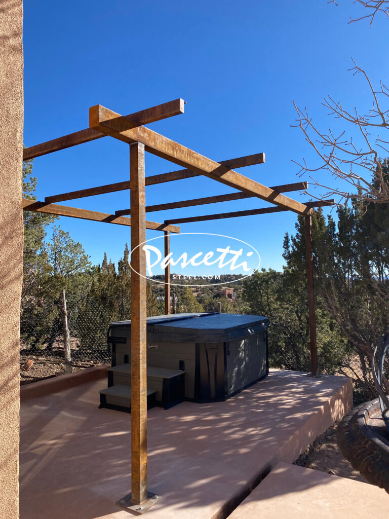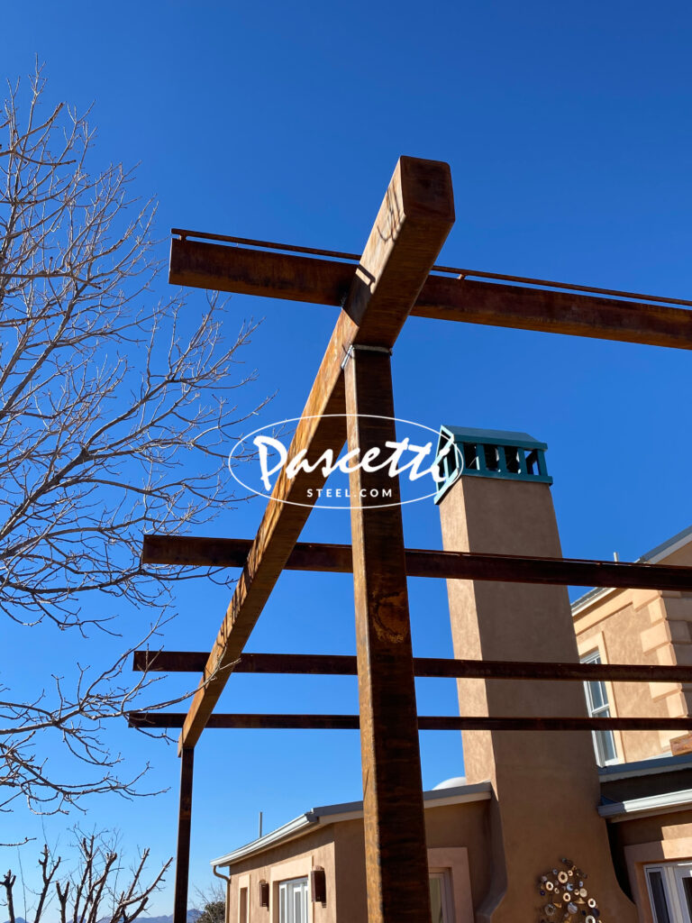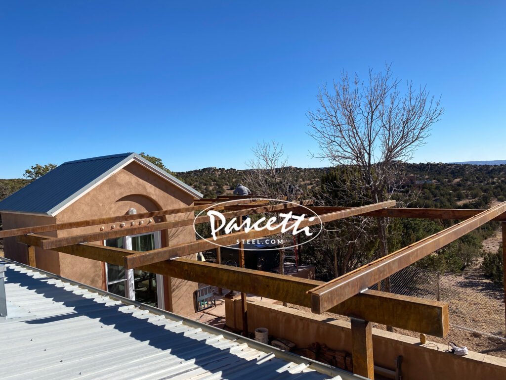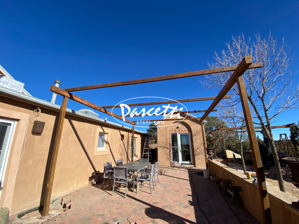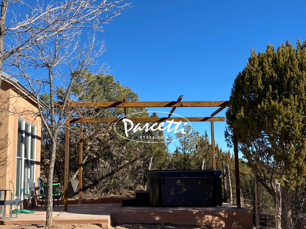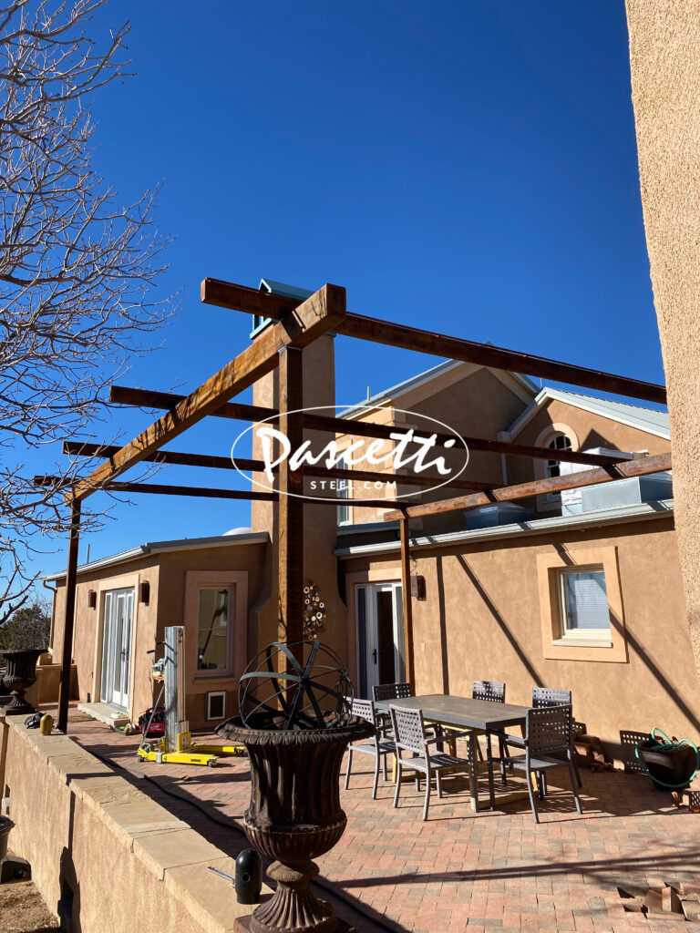 This beautiful new latilla shade structure replaced a standard wood frame with a new steel tube structure with natural latilla shade slats. This home location required a strong steel frame to withstand the high winds, the natural rusted finish resists the elements with no maintenance and gives and beautiful rust patina over time. Additional custom steel brackets were welded into the frame to accept the wood latillas.