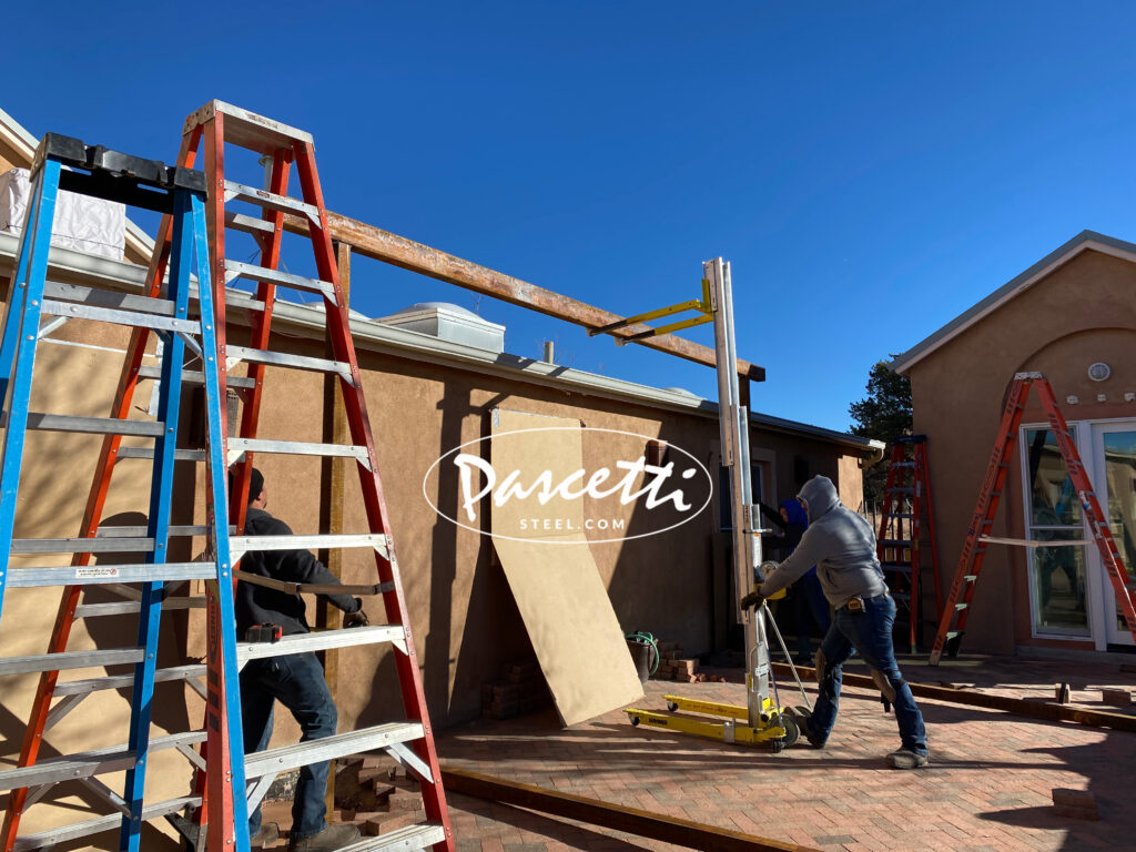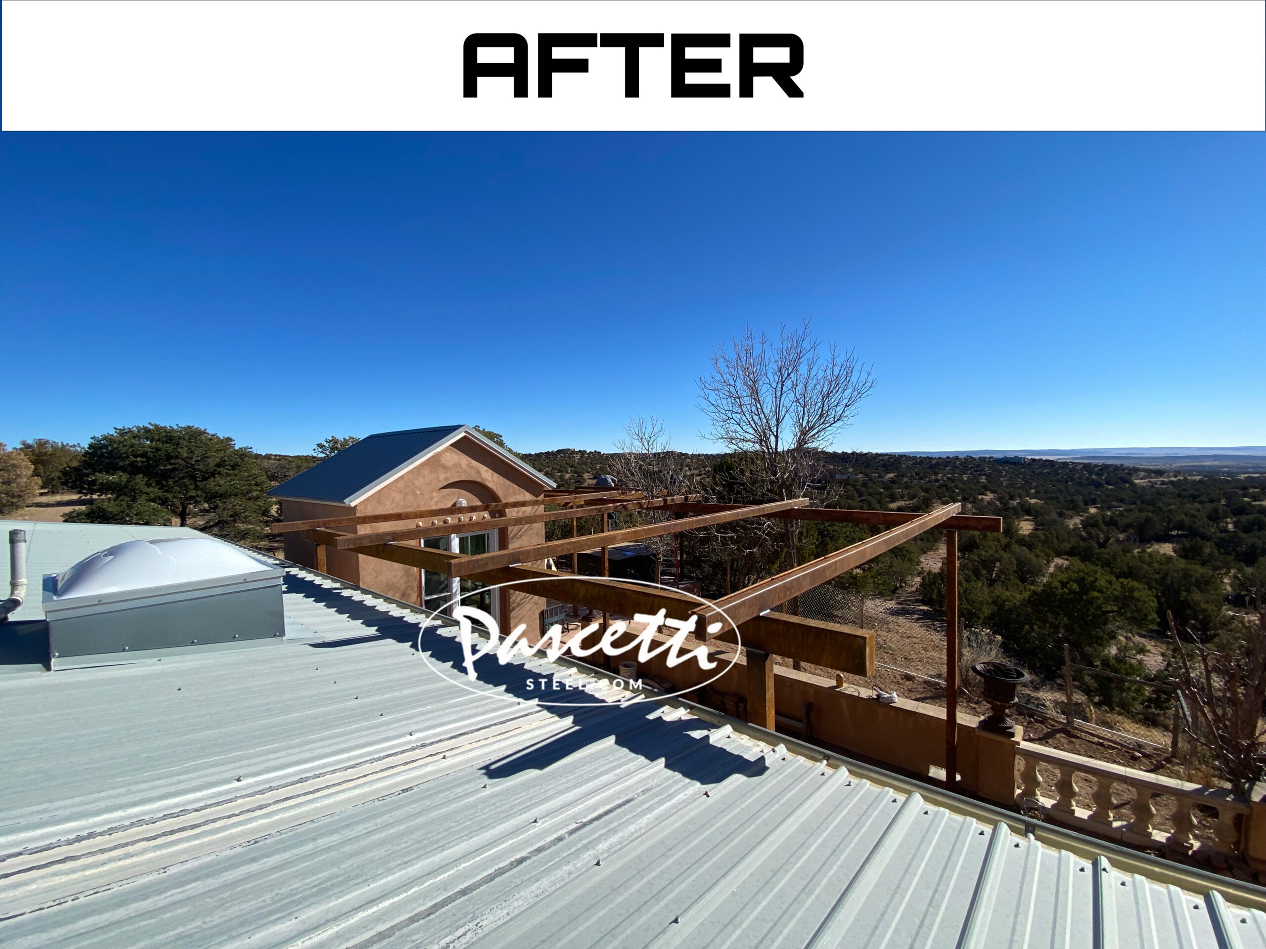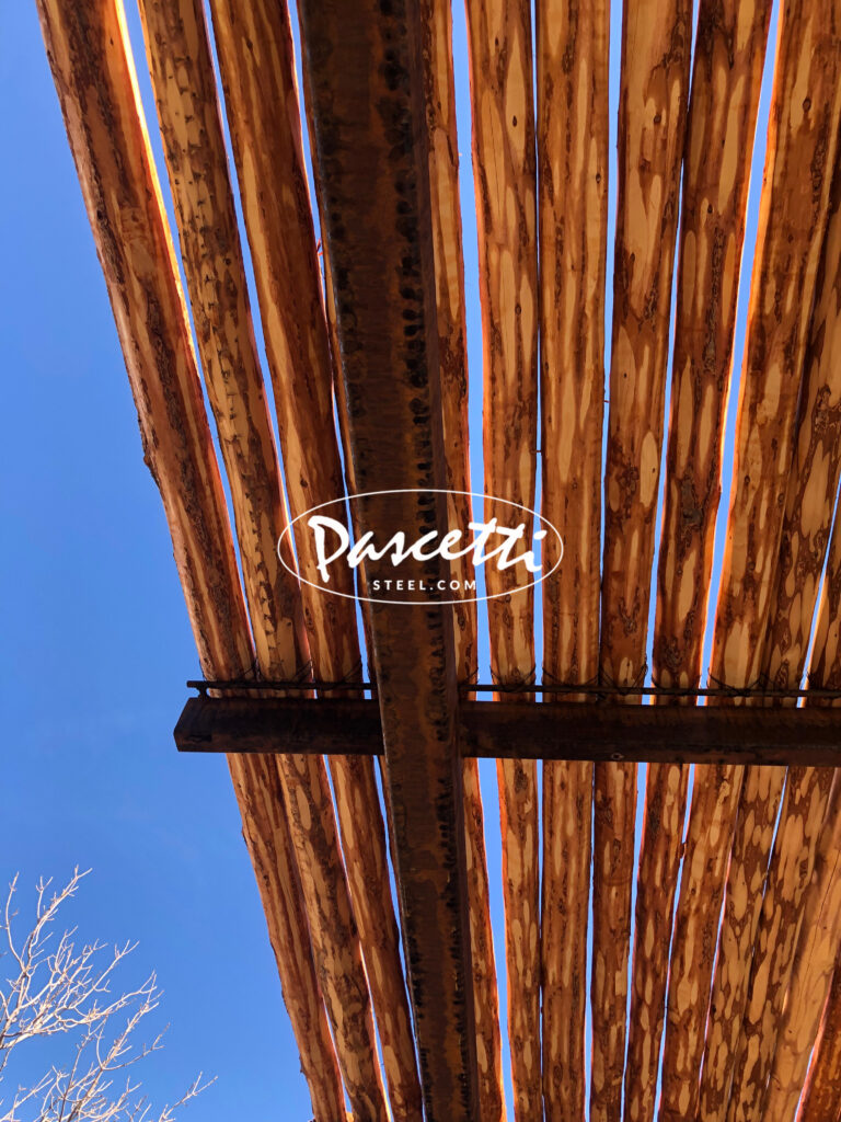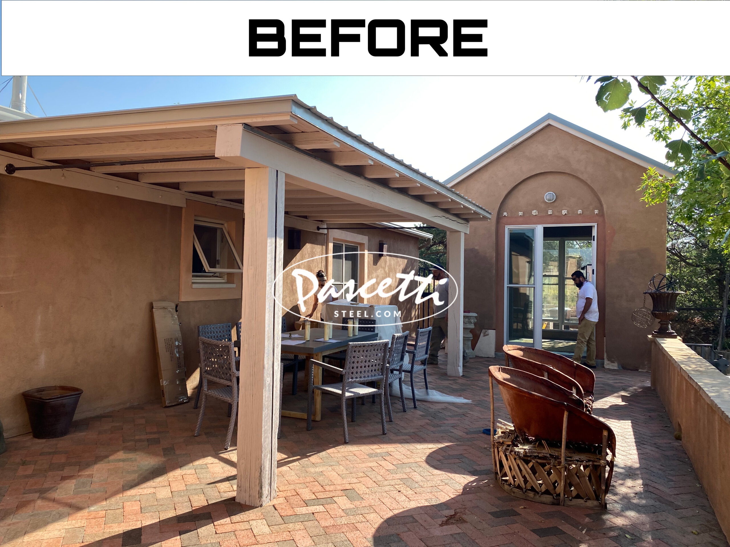 This beautiful new latilla shade structure replaced a standard wood frame with a new steel tube structure with natural latilla shade slats. This home location required a strong steel frame to withstand the high winds, the natural rusted finish resists the elements with no maintenance and gives and beautiful rust patina over time. Additional custom steel brackets were welded into the frame to accept the wood latillas.