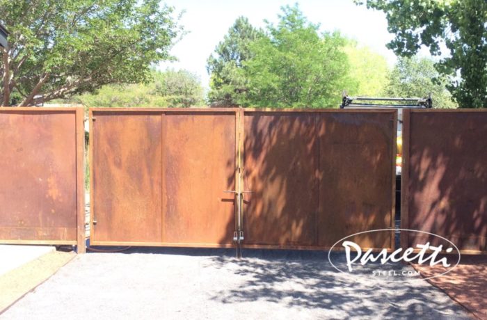Natural rust solid panel gate. Gates do much more than provide security and privacy; they also add beauty to homes and landscapes. Whether it’s a simple steel picket gate for a patio, or one of our custom forged ornamental steel gates, we’ll help you select the right gate and latch combination for your setting. […]