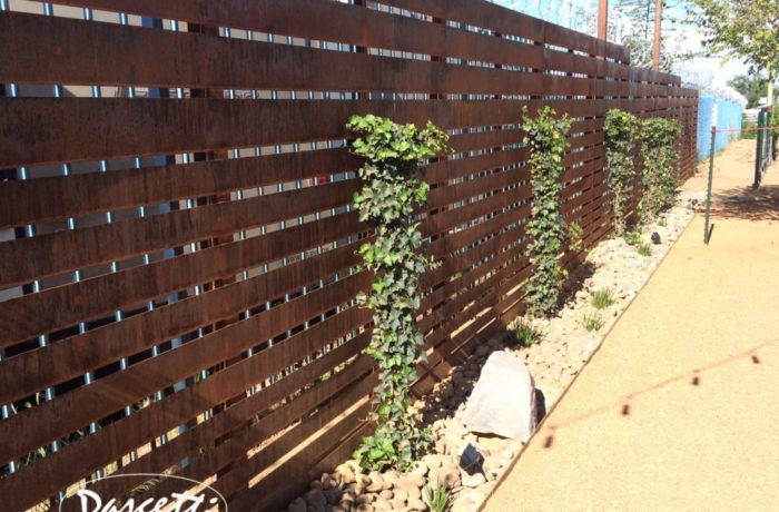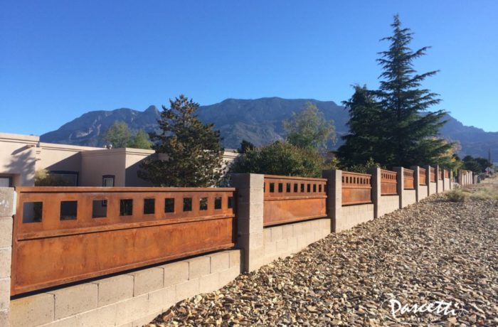 Fences do much more than provide security and privacy; they also add beauty to homes and landscapes. Our custom fences are designed for courtyards, patios, entries, pools and more with a wide range of styles such as this solid metal fence. We plan safety and stability into every design we make, our custom fences are fabricated to be strong, durable and visually appealing.