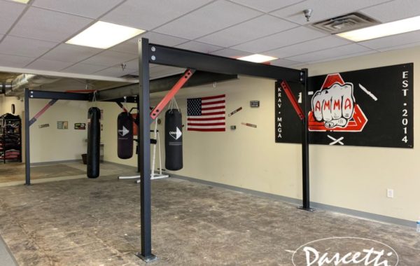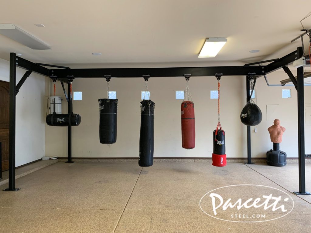 Pascetti Steel has recently designed, fabricated and installed custom commercial gym equipment for two local gyms in Albuquerque. Pascetti Steel fabricated a new engineered system for multiple heavy bags at the Open Gym. This rack holds up to thirty heavy bags on a rolling track system to easily move the bags for other activities.